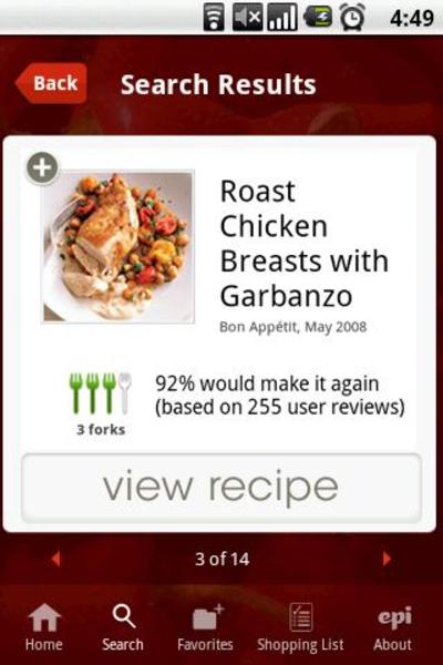 Cada receta se encuentra organizada en base a varios aspectos, tales como el tipo al que pertenecen y la época del año en la que tienden a elaborarse. Epicurious te ofrece la posibilidad de publicar comentarios sobre las recetas, subir fotos de las mismas tras realizarlas para que se sumen a las que ya de por sí aparecen en las recetas e incluso anotar automáticamente todos los ingredientes de cada una de ellas para acudir con la lista a tu supermercado con el fin de adquirir los productos necesarios para elaborarla.